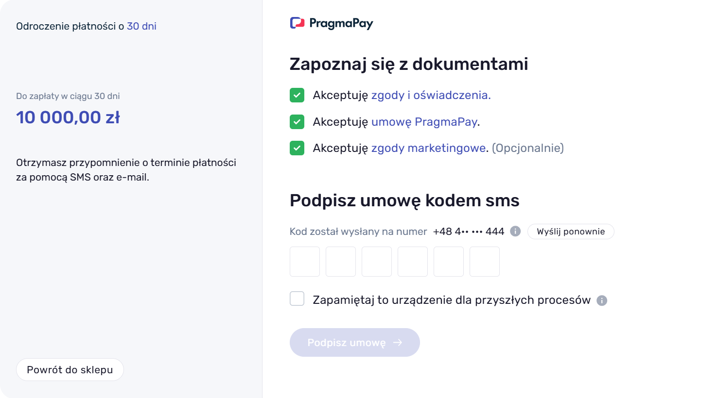 Bez podpisywania umów, bez skanów, bez wizyt. Potwierdzasz transakcje kodem SMS.